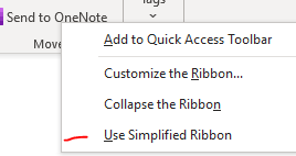 User can move from simplified to classic view by right clicking on any of the icon in the ribbon and select the preferred one.