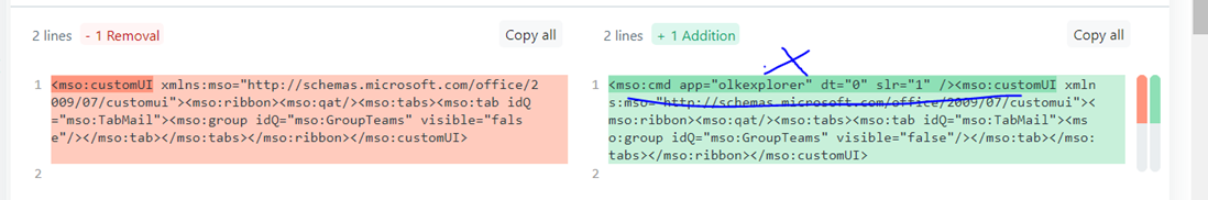 A) In this example, we will delete “<mso:cmd app=”olkexplorer” dt=”1″ slr=”0″ />”