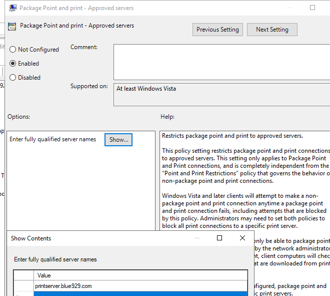 HKEY_LOCAL_MACHINE\Software\Policies\Microsoft\Windows NT\Printers\PackagePointandPrint\ListofServers