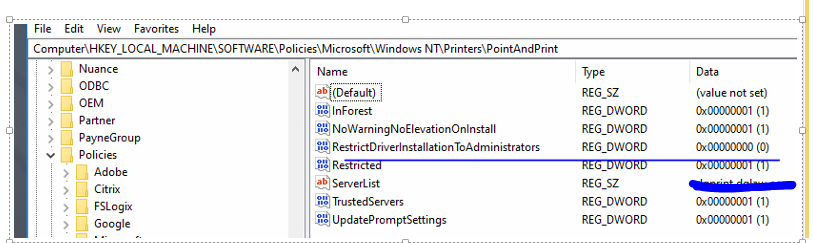 HKEY_LOCAL_MACHINE\Software\Policies\Microsoft\Windows NT\Printers\PointAndPrint\RestrictDriverInstallationToAdministrators