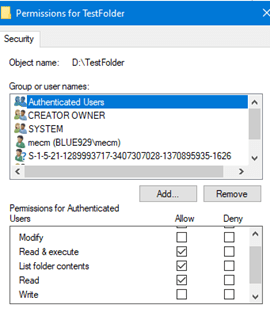 Server: Mecm2 File share location: D:\drive Sharing permission for D\: Authenticated users [Read] Network path: \\mecm2\TestFolder Sharing permission for Test folder: Authenticated user [Read/execute, Read, List folder content]