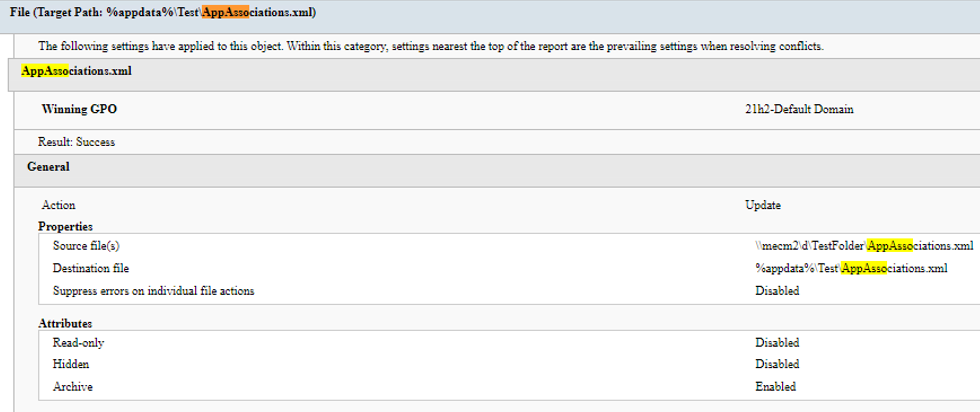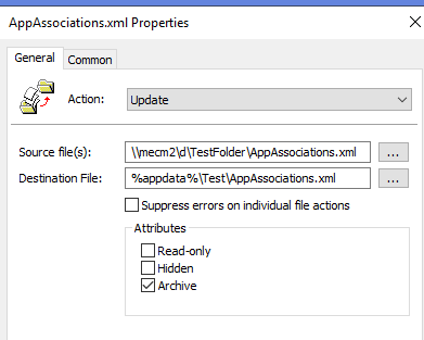 The update action will be used so files do not get overwritten. If the file doesn’t exist, it will copy the file to the destination, if the file name already exist, it will NOT overwrite it. In the previous copy, AppAssociation has 11:53 AM edit time on the %appdata%\test destination and the AppAssociations edit time here shows 1:03 PM. After the policy applied, the 1:03 Pm did not show up because the file already exist, which means it did not get copied over if same file name already exist.