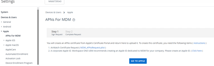 5. Navigate to Groups & Settings > All Settings > Devices & Users > Apple > APNs For MDM in the Workspace ONE UEM Console.