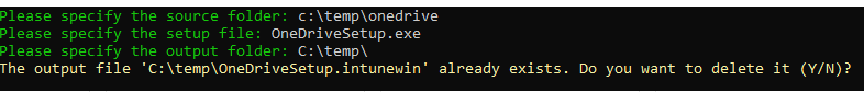 - Run IntuneWinAppUtil.exe and fill in the source location, setup file and output location like so, hit enter and wait for the wizard to complete. It should generate a .intunewin file after its done.