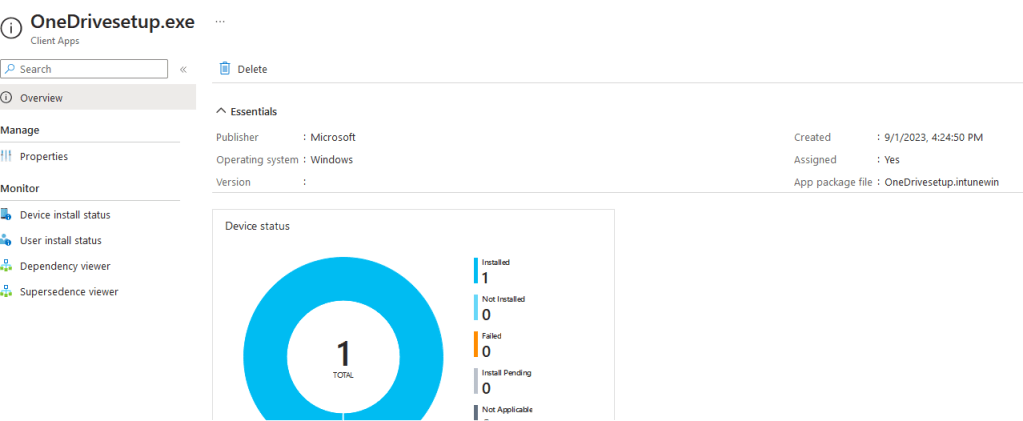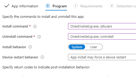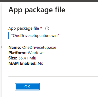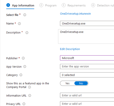 From Intune navigate to Apps > Add App > Windows App (Win32) and select the OnedriveSetup.intunewin file from your c:\temp in step 1. Fill in the required details as you see fit.