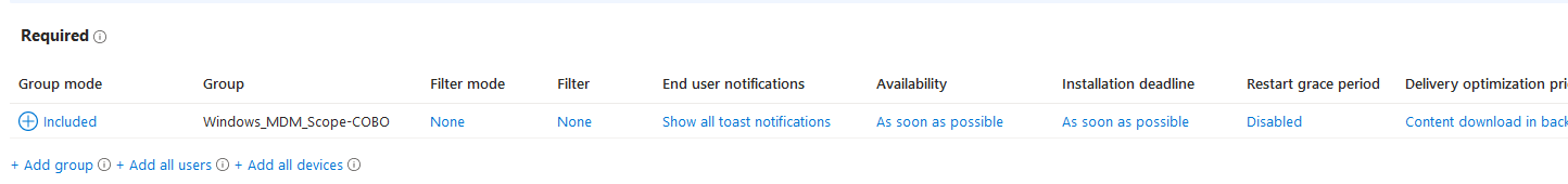 Configure the remaining options to suit your organization and deploy accordingly. In my case I am requiring users in an azure group to install the app.
