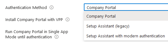 Company Portal- the portal will install as soon as user finishes the enrollment in order to authenticate. The user MUST log into the portal to access resources. Great use the following is being utilized: • Works with VPP (volume purchase program) enabling the company portal to install without user Apple IDs. • Use multi-factor authentication (MFA). • Register devices in Azure AD and use features available with Azure AD, such as conditional access. • Allow password change • You want to lock the device until the Company Portal app installs. Setup assistant with Modern Authentication- For devices running iOS/iPadOS 13.0 and later, users must log in and authenticate during out-of-box experience (OOBE) enrollment with Setup Assistant phase, prior to users accessing the home screen. Users are required to authenticate with their Azure AD credentials twice: once during enrollment with Setup Assistant, and then again when they sign in to the Company Portal • Works with VPP (volume purchase program) enabling the company portal to install without user Apple IDs. • Use multi-factor authentication (MFA) • Register devices in Azure AD and use features available with Azure AD, such as conditional access. • Allow password change • MFA will not work if you're using a 3rd party MFA provider to present the MFA screen during enrollment. Only the Azure AD MFA screen works during enrollment. Setup Assistant (legacy) - for older apple devices, does not support MFA or registers device to Azure AD. ** When enrolling an iOS/iPadOS device with Setup Assistant with Modern Authentication, app configuration policies are automatically applied to the iOS/iPadOS device. Don’t send a separate app configuration policy to the Company Portal for those iOS/iPadOS devices or it will result in an error.