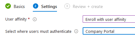 Enroll with User Affinity - Choose this option for devices owned by users who wish to utilize the Company Portal for services such as app installations. Enroll without User Affinity - Select this option for devices that aren't affiliated with a single user. Use this option for devices that don't access local user data. This option is typically used for kiosk, point of sale (POS), or shared-utility devices. Enroll with Azure AD shared mode- Select this option to enroll devices that will be in shared mode. Shared device is a single device with multiple user authenticating into it.