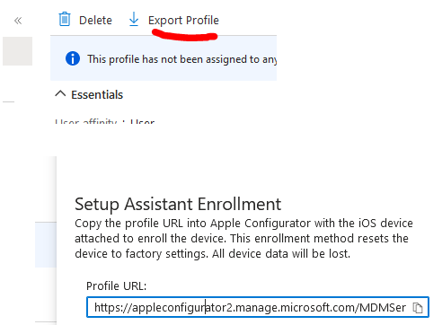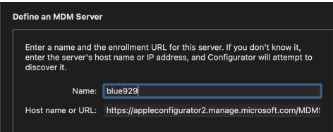 In order get MDM server url: • Create a profile under Device Enrollment > Apple Enrollment > Apple Configurator in Intune • Open the profile created above, and click on 'Export Profile' • Use the URL generated to add an MDM server in Apple Configurator. The URL should start with [https://appleconfigurator2.manage.microsoft.com/]