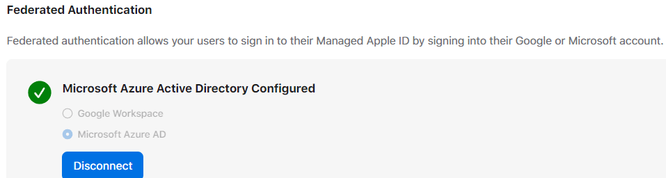 The method of federated authentication that will get configured is called SCIM (System for Cross-domain Identity Management). SCIM syncs accounts from Azure to ABM, so any accounts removed from Azure will also reflect on ABM as they get deactivated. This removes a lot of manual process that may be involved as far as account provisioning from both Azure and ABM.