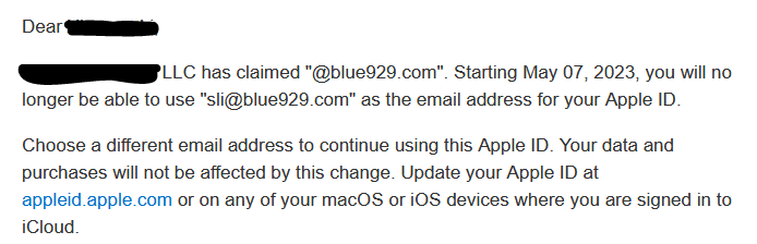 - If there is an existing apple ID account attached the company domain, admin will get this email: