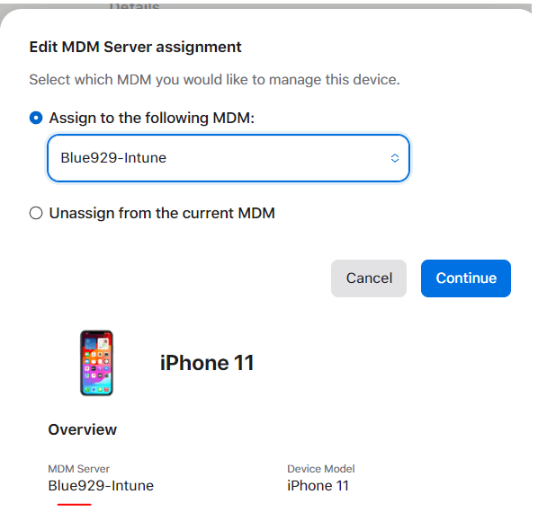 2. Reassign the device to the Intune MDM server in ABM. Select the device and click on edit MDM server. Assign it to company MDM server.