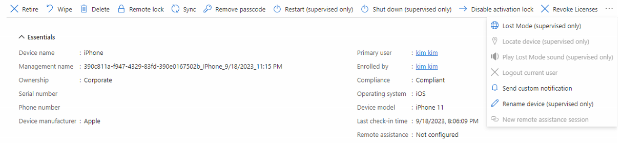 • Feel free to create a custom home screen layout/wallpaper/lock screen message under devices > configuration profile > new profile > templates > device features [This is locked and user cannot edit] • If device would NOT properly pick up the profile configured in Enrollment Program Tokens, trigger a erase all content and settings' in Apple Configurator • To avoid issues enrolling, release the device from ABM and then remove the organization from apple configurator 2. To set up AC2 again, use the same existing supervisor identity as before or create a new one ONLY if there's no device. • There is a grace period 30 days during which users can remove the device from supervision (locked enrollment). There's currently way to prevent and lock this setting immediately. • To re-enroll a supervised device: o Wipe the device in the Microsoft Intune admin center. o Retire the device in the admin center, and then reset the device to factory settings using the Settings app, Apple Configurator 2, or iTunes. • If MFA is setup for the user and they do not have a second device to authenticate against, set a one-time bypass for the user.