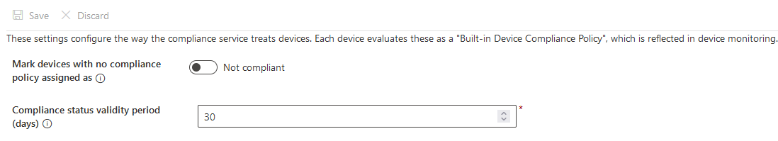 Compliance status validity period- The device must check into Intune within 30 days, check in refresh every 8 hours. After 30 days past and there is no active sync, device is marked non-compliant. This is tied to “Is Active” setting under default device compliance policy.