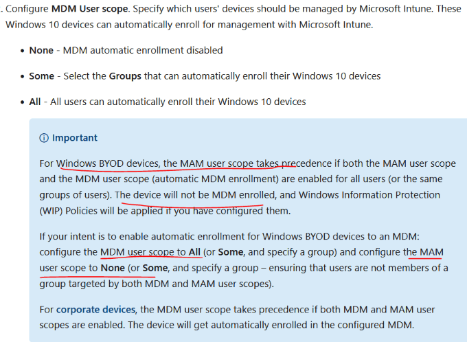 MDM user scope: When set to Some or All, devices are joined to Azure AD, and devices are managed by Intune. It doesn’t matter who’s signed in to the device, or if devices are personal or BYOD. When set to None, devices aren’t joined to Azure AD, and aren’t managed by Intune.