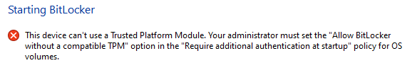 A configuration policy must be configured to enable Bitlocker and also enable support for Non-Compatible TPM chips or you will see this error.