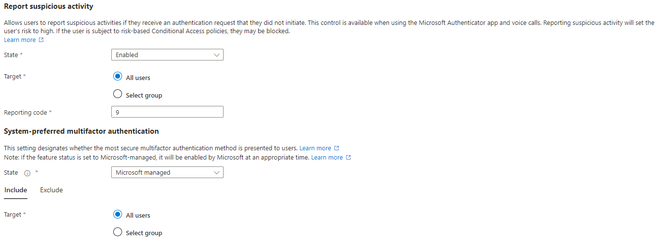 Enable- Allows users to report suspicious activities if they receive an authentication request that they did not initiate. This control is available when using the Microsoft Authenticator app and voice calls.