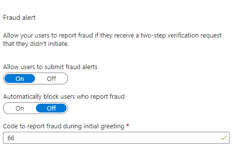 - Toggle off to block users who report fraud. (Conditional access policy can block high risk users instead)