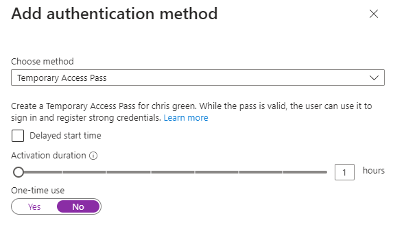 *Assign TAP to user by going to user > authentication method > add authentication method > select TAP. If “Add authentication method” is not present, go to users from Azure AD and not Entra