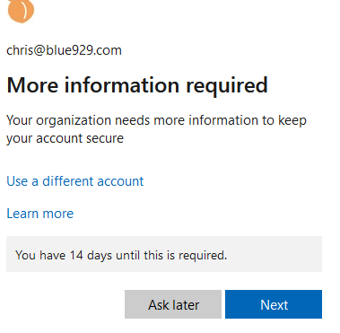 Microsoft Entra ID Protection will prompt your users to register the next time they sign in interactively and they’ll have 14 days to complete registration. During this 14-day period, they can bypass registration if MFA isn’t required as a condition, but at the end of the period they’ll be required to register before they can complete the sign-in process.