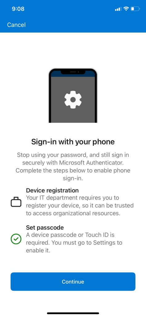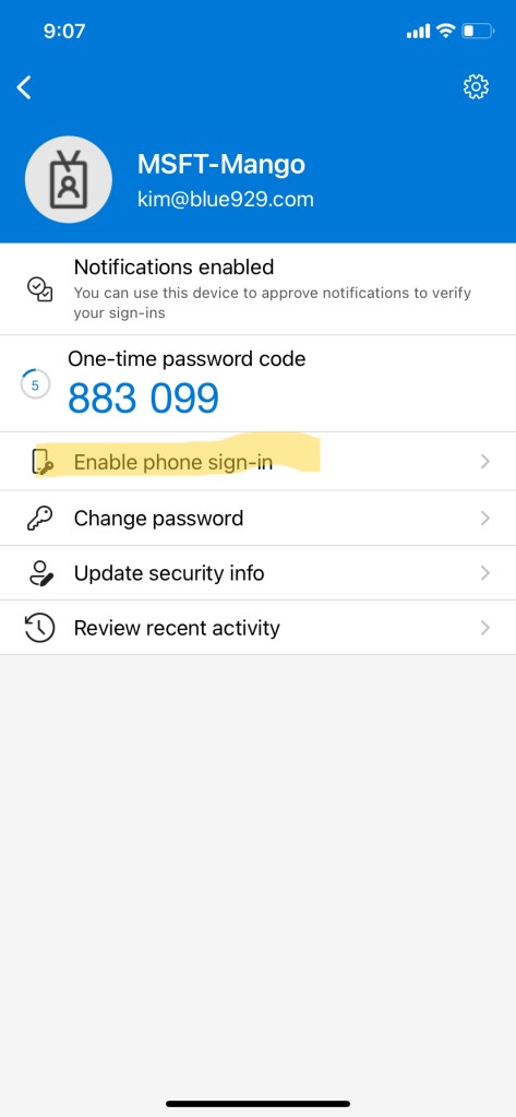 After users registered themselves for the Microsoft Authenticator app, they need to enable phone sign-in: 1. In Microsoft Authenticator, select the account registered. 2. Select Enable phone sign-in. 3. Follow the instructions in the app to finish registering the account for passwordless phone sign-in 4. Once phone sign in is complete, there should be an option- disable phone sign in. This means it is enable. **If there is no option to enable phone sign-in, remove the account and re-add it. If you encounter issues trying to register the device, close all tabs and clear cache from the browsers
