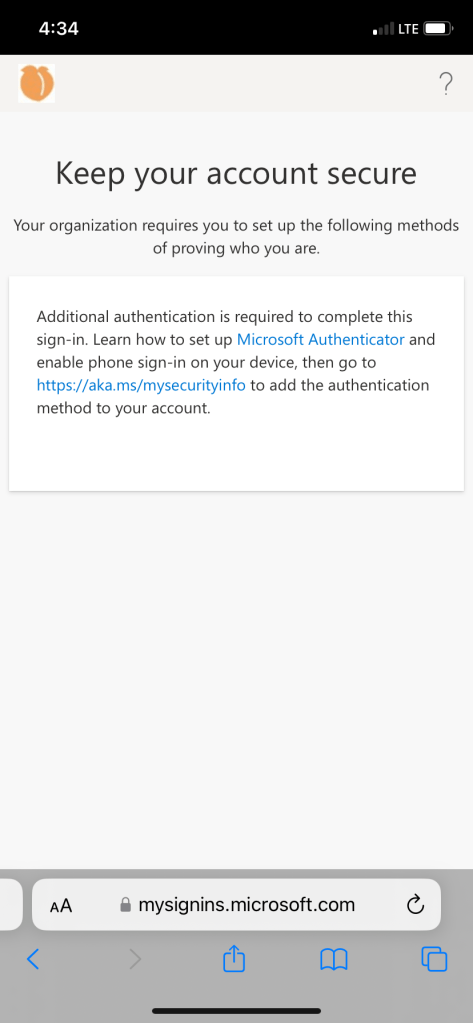 If CA policy targets all cloud apps, there may be issues of re-adding users account to Microsoft authenticator app since it also targets the azure directory home page. User may experience a loop where they get to the end and cannot reach their security info page (aka.ms/mysecurityinfo) without logging in with passwordless authentication. User may see the prompt below (1)