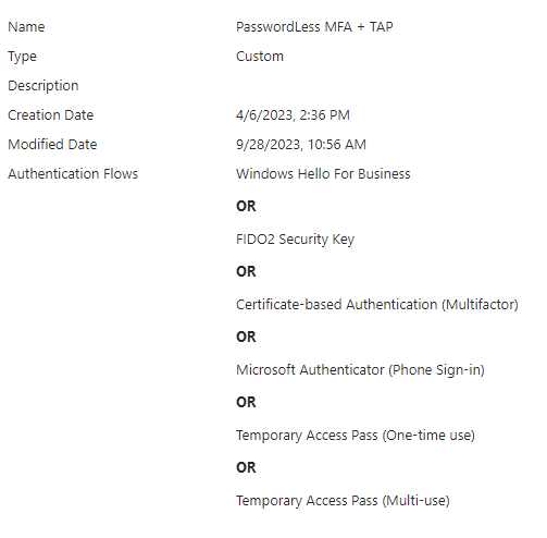 The Built-in Passwordless MFA authentication strength does not suffice in this lab as TAP (Temporary Access Pass) is enabled for all users. A new custom strength must be created to include TAP.