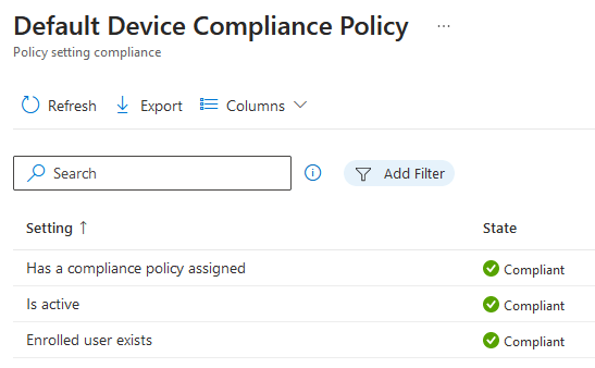 One way to view the default device policy > Go to devices > select a device > device compliance > Default device compliance policy.