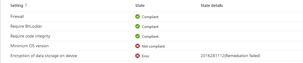 Under encryption of data storage on device- it MAY show a -2016281112 (Remediation failed) error even if Bitlocker is enabled.