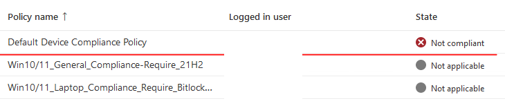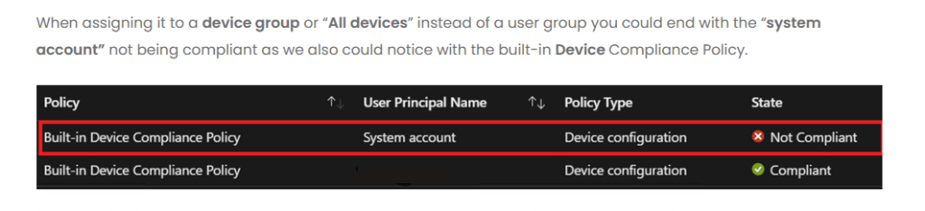 Similarly, when a compliance policy is assigned to a device group and evaluated while a user is signed in, there are two compliance evaluations: one for the user and the one for the devices System account. In this scenario, the System Account evaluation can fail, causing the device to be Not compliant. To prevent this behavior: