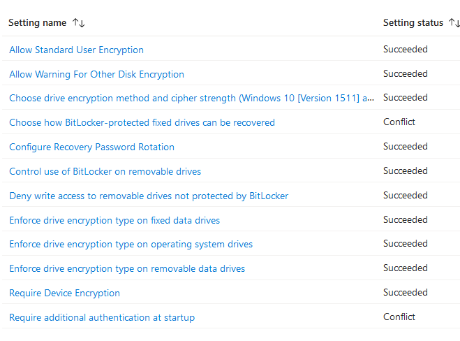 5. If there is multiple bitlocker profile, make sure there is no conflict between endpoint security disk encryption policy and endpoint protection template from device configuration policy.