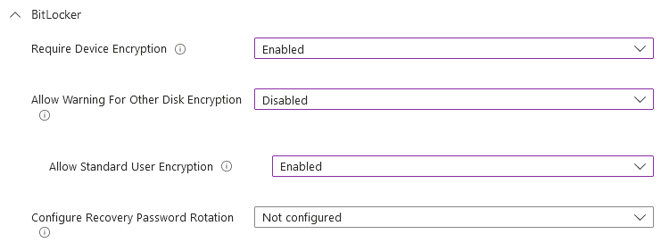 Endpoint security disk encryption policy for BitLocker- The BitLocker profile in Endpoint security is a focused group of settings that is dedicated to configuring BitLocker. This contain most of the encryption settings for Bitlocker. MacOS file vault settings are also set here.