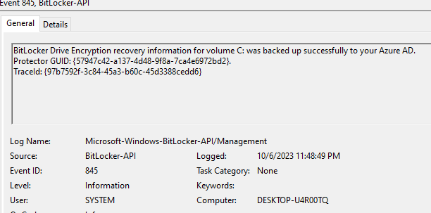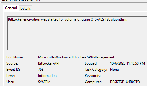 From device event log > Application and service logs > Microsoft > Windows > Bitlocker-API > Management