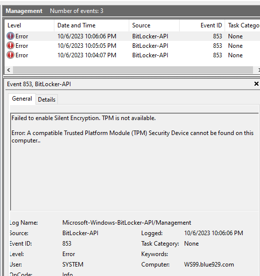4. Error 65000 – this means the device did not meet the requirement for encryption, which requires TPM to be 1.2 and needs to be enabled.