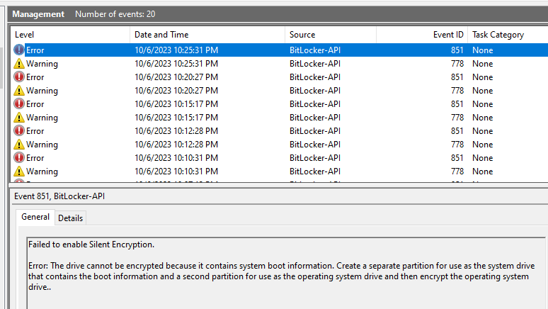 6. Failed to enable silent encryption because drive contains system boot information-Device cannot have dual boot on it or windows boot manager cannot be on the same partition as OS.