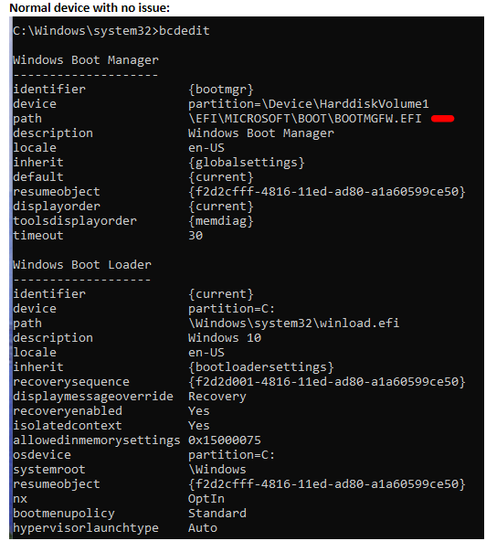Verify the PCR validation profile of the TPM in CMD: Manage-bde.exe -protectors -get %systemdrive% Verify secure boot state: • Select Start, and enter msinfo32 in the Search box. • Verify that the Secure Boot State setting is On Powershell (Admin) Confirm-SecureBootUEFI (If the computer supports Secure Boot and Secure Boot is enabled, this cmdlet returns "True.")