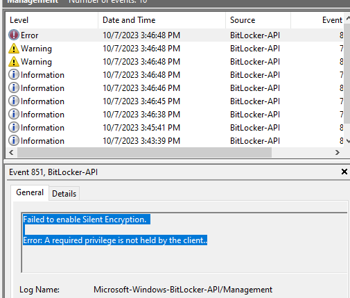 11. If silent encryption does not work due to Event ID 854: WinRE is not configured