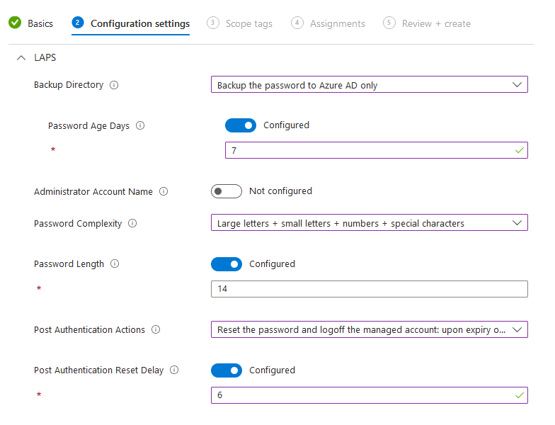 Backup Directory - Configure where to back up the password. Cannot back up to both azure and on premise. Password Age Days - Default value of 30 days, minimum is 7 days for azure device until password rotates Administrator Account name - If not configured, the password policy will apply to the built in administrator account that comes with every windows installation. If there is a custom local administrator account, specify it here. Note that if a custom local admin account is being used, it must be created first on all corporate devices either via script or policy. Password complexity - I suggest Large letters + small letters + numbers + special characters Password length - Leave it to 14 Post authentication action - The listed actions will trigger after the password age days hits day 7. It will either log off or reboot the device. Post authentication reset delay - configure a delay in hours before the authentication action sets off. If set to 6, it will only log out the admin after 6 hours post log in.