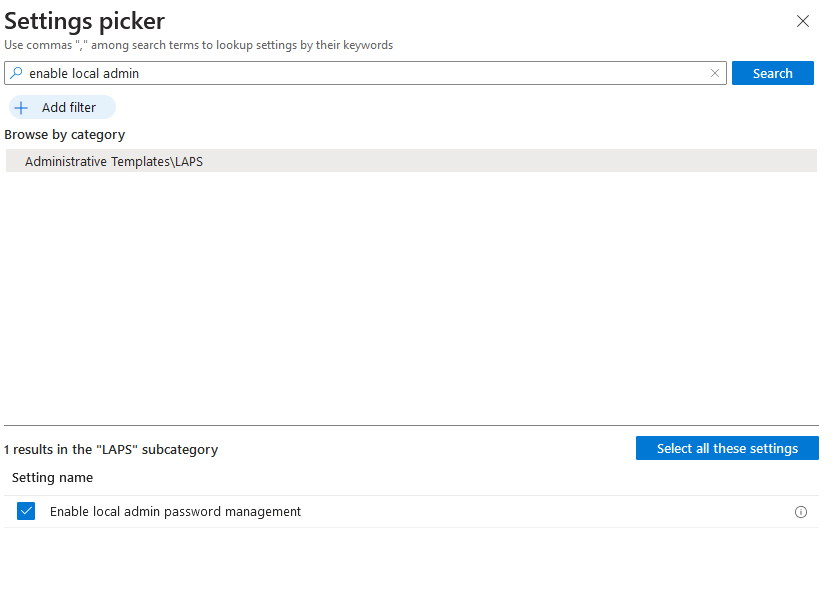Under configuration settings > Add settings > search for the following: Accounts Enable Administrator Account status = Enable Enable local admin password management = Enable