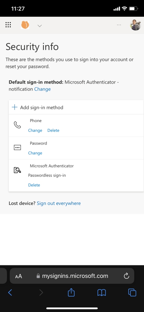 - Once the sign in methods are registered, navigate to security registration page [mysignins.microsoft.com/security-info], the user will not see MFA challenge since policy excludes trusted locations