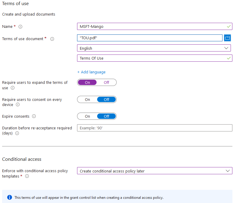 Term of use document- Upload the pdf document, tag it with language and set the display name of the Tou