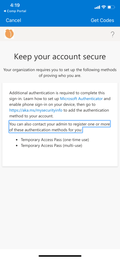 Once TAP has been issued to the user, they will encounter this prompt when trying to sign into company portal. TAP will fulfill MFA requirement.