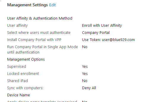 If VPP is configured, sign into app store with “alex@blue929.com” in order to download all the necessary apps. This is only required once per enrollment.