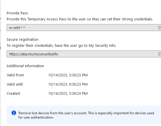 To issue a TAP for user: Navigate to User > authentication methods > add authentication methods > Temporary Access Pass