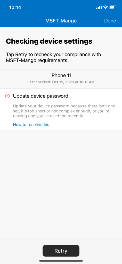 This device-based conditional access policy requires users’ personal and corporate devices to be marked as compliant before accessing any Office 365 applications. Any modification to device settings after enrollment will block access to the apps. This policy requires devices to be compliant at all times. This policy discourages user from modifying their phone security settings and help protect sensitive business data.