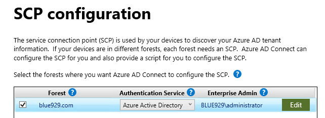 Under SCP configuration, use on premise enterprise admin account and make sure the forest is correct.