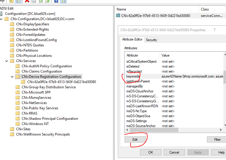 Go to CN=Services > Select “CN=Device Registration Configuration” > Properties > keywords should have the correct tenant name fulfilled.