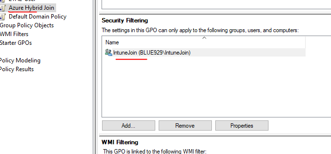 Once the forest is configured for Hybrid join, we will roll out group policy to target a specific group (IntuneJoin). That group contains devices that will be managed by Intune.
