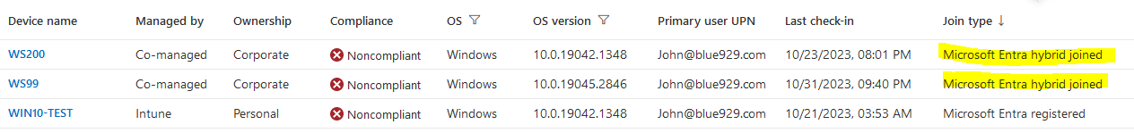 The device will initially show a pending state, and then it will appear in the Intune portal after a period of time. The image below shows an Intune-managed device and a co-managed device. The co-managed device is shown because I have configured a tenant attachment with SCCM/MECM in my lab. If SCCM is not being used, Intune is the MDM authority.