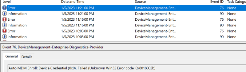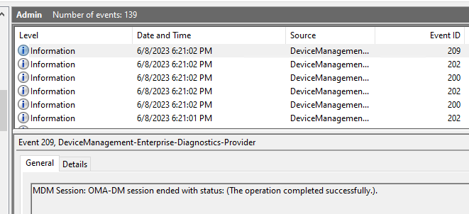 Review logs: Event viewer > Applications and Services Logs > Microsoft > Windows > DeviceManagement-Enterprise-Diagnostic-Provider